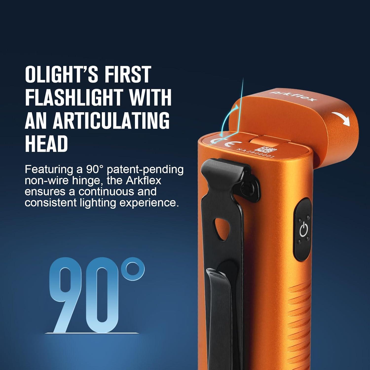 imageOLIGHT Arkflex Adjustable Right Angle EDC Flashlight 1000 Lumens Rechargeable Handheld Lights TwoWay Pocket Clip with an 090Articulating Head for Working Outdoors and Repairing Orange