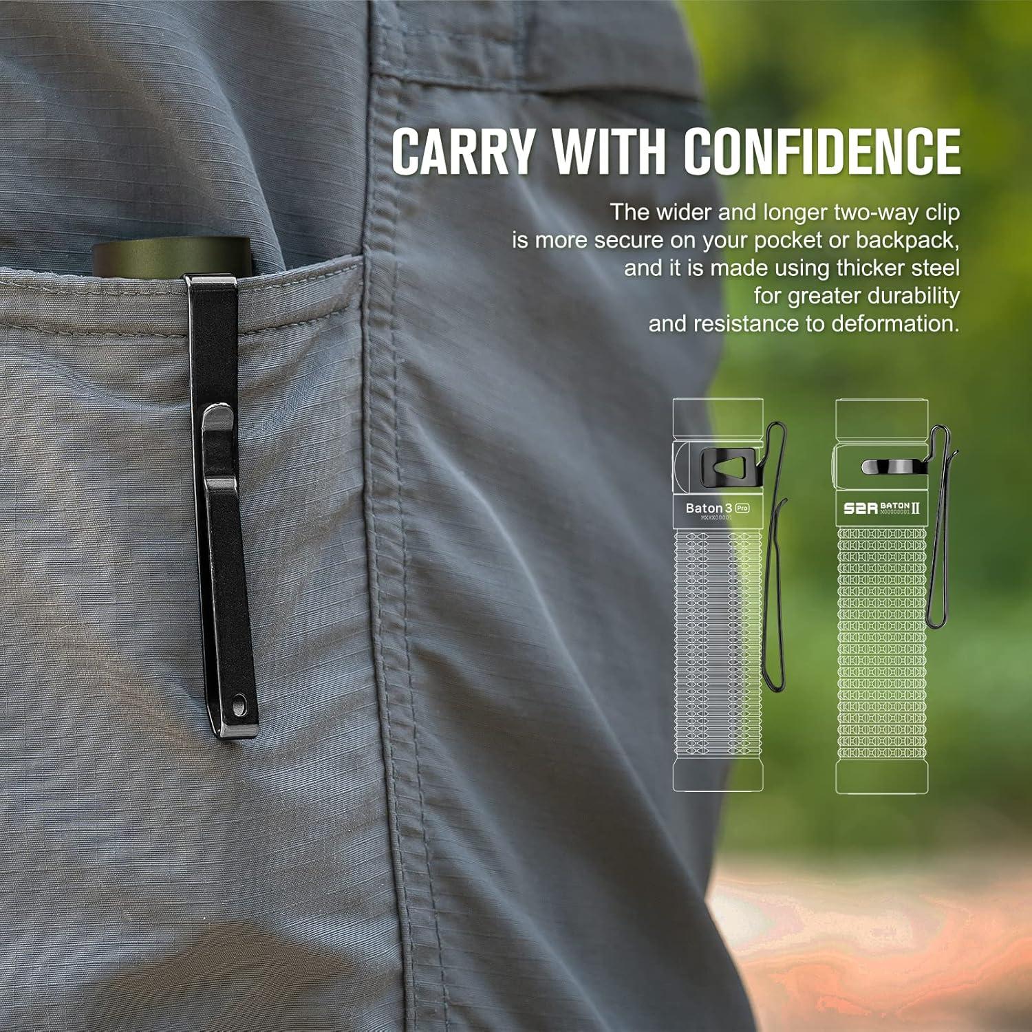 [Two-way Clip] Designed with wider and longer two-way clip, the flashlight can stay securely in your pocket or backpack. It is made of thicker steel that is perdurable and resists deformation